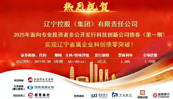 12月29日,辽控集团在上海证券交易所成功发行2025年第一期科技创新公司债券,发行规模2亿元,债券期限3年期,票面利率2.68%。此次发行实现辽宁省属企业科技创新公司债券“零突破”,是集团践行国家战略、发挥国有资本平台优势、以资本赋能产业升级的具体实践,也为辽宁省产业转型升级注入强劲金融动力。