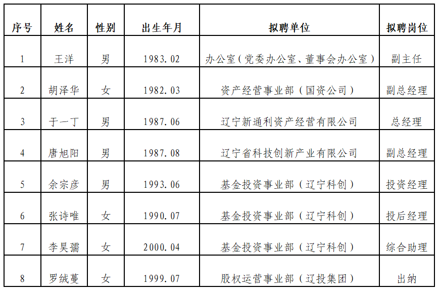 根据省属企业员工招聘有关规定,经资格审核、笔试线上测评、面试、背景调查、体检等程序,确定以下人员为辽控集团拟录用人员,现予以公示。公示期间如有问题,请向辽控集团纪委反映。